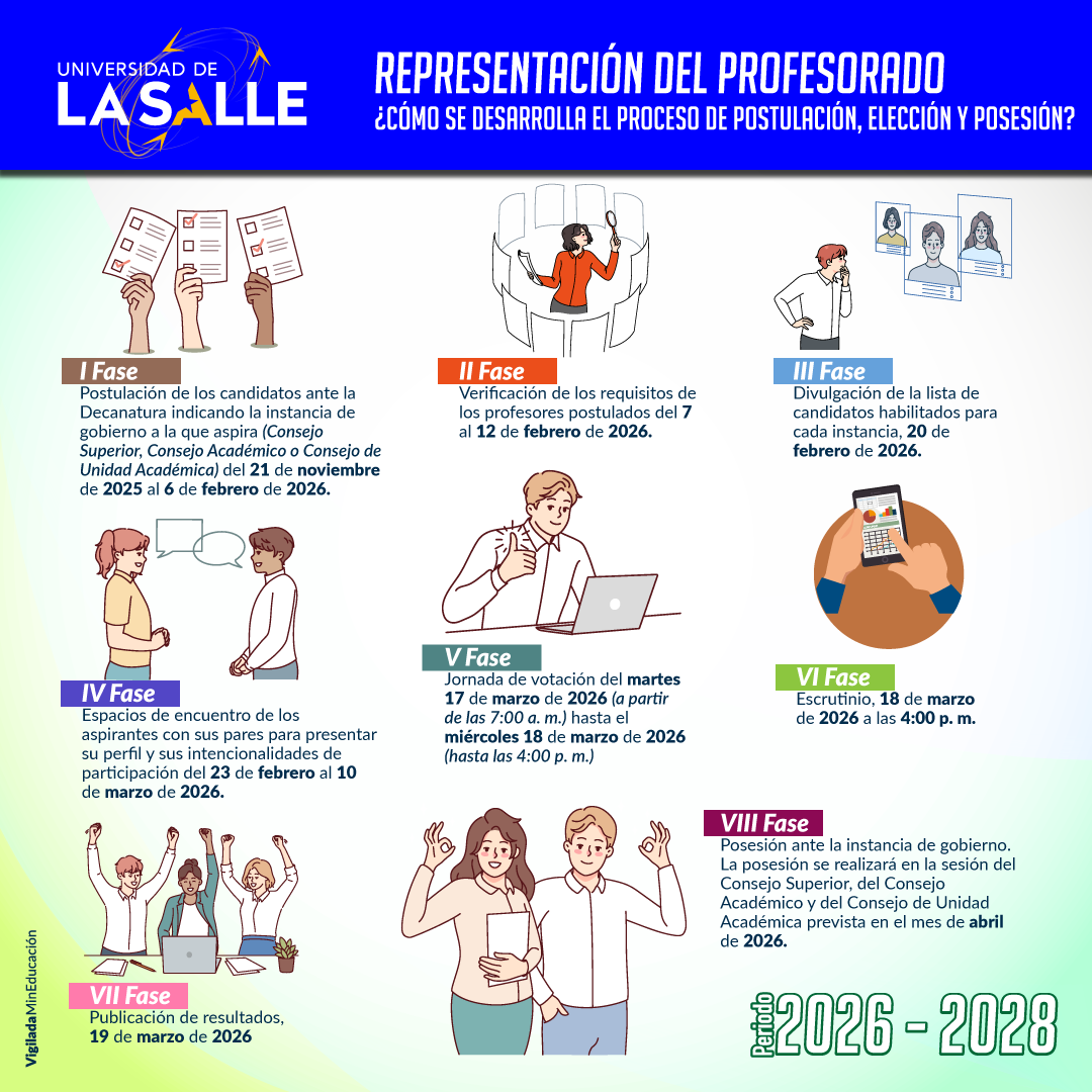 La Universidad de La Salle reitera su compromiso con la participación plural, el diálogo y la construcción democrática. Invitamos a los profesores a presentar su candidatura y a fortalecer, desde su liderazgo académico, las instancias de gobierno universitario.